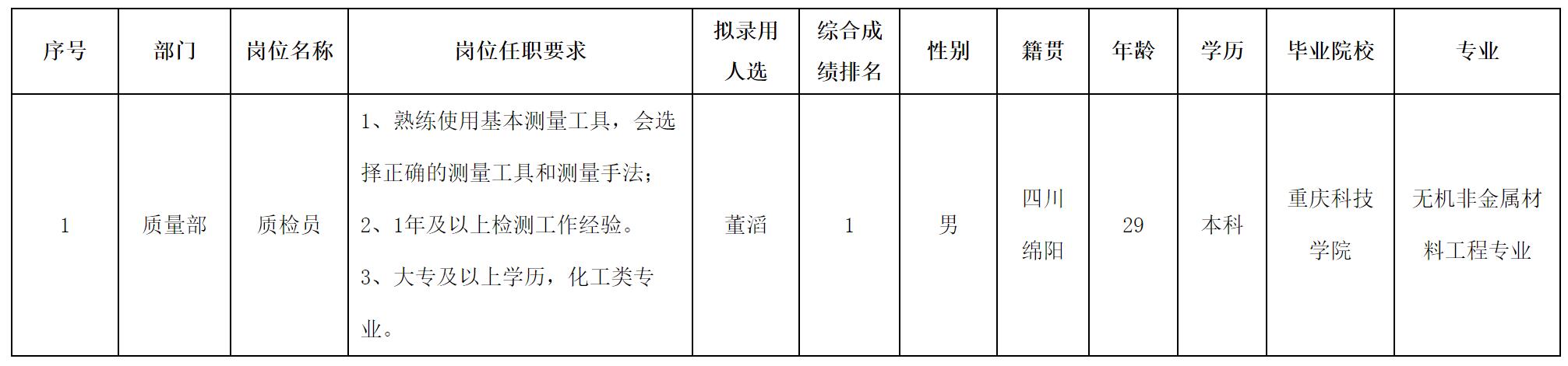 根据四川长虹新材料科技有限公司发布的招聘公告及招聘相关规定,经面试、考察、体检等程序,拟录用董滔同志到四川长虹新材料科技有限公司工作,现予以公示,具体情况如下:
