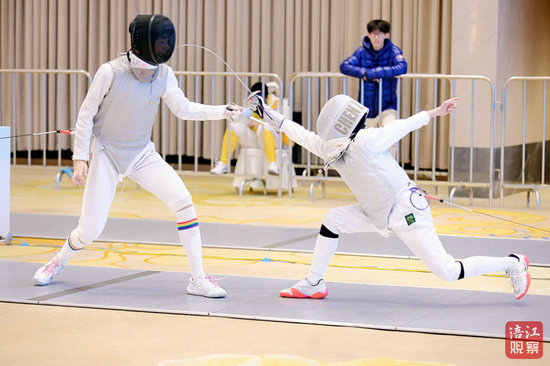 红方选手步伐灵动,试探性地几次点刺,剑尖划破空气发出“嗖嗖”轻响。蓝方选手则稳如磐石,以精确的防守姿势应对。突然,红方一个迅捷地向前一步接弓步冲刺,剑身如银蛇出洞,直刺对方有效部位。“滴!”计分器红灯亮起,清脆的提示音响彻全场,宣告了总决赛的第一个有效得分诞生。