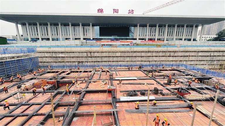 绵阳火车站站前广场及周边配套设施建设项目分多段同时进行,其中站前广场分为8个区段。“目前,广场项目基础工程已基本完成,桩基工程全部完工,冠梁、土方开挖等工序完成率超60%,地下工程进度过半。”该项目党支部书记顾鹏飞介绍。