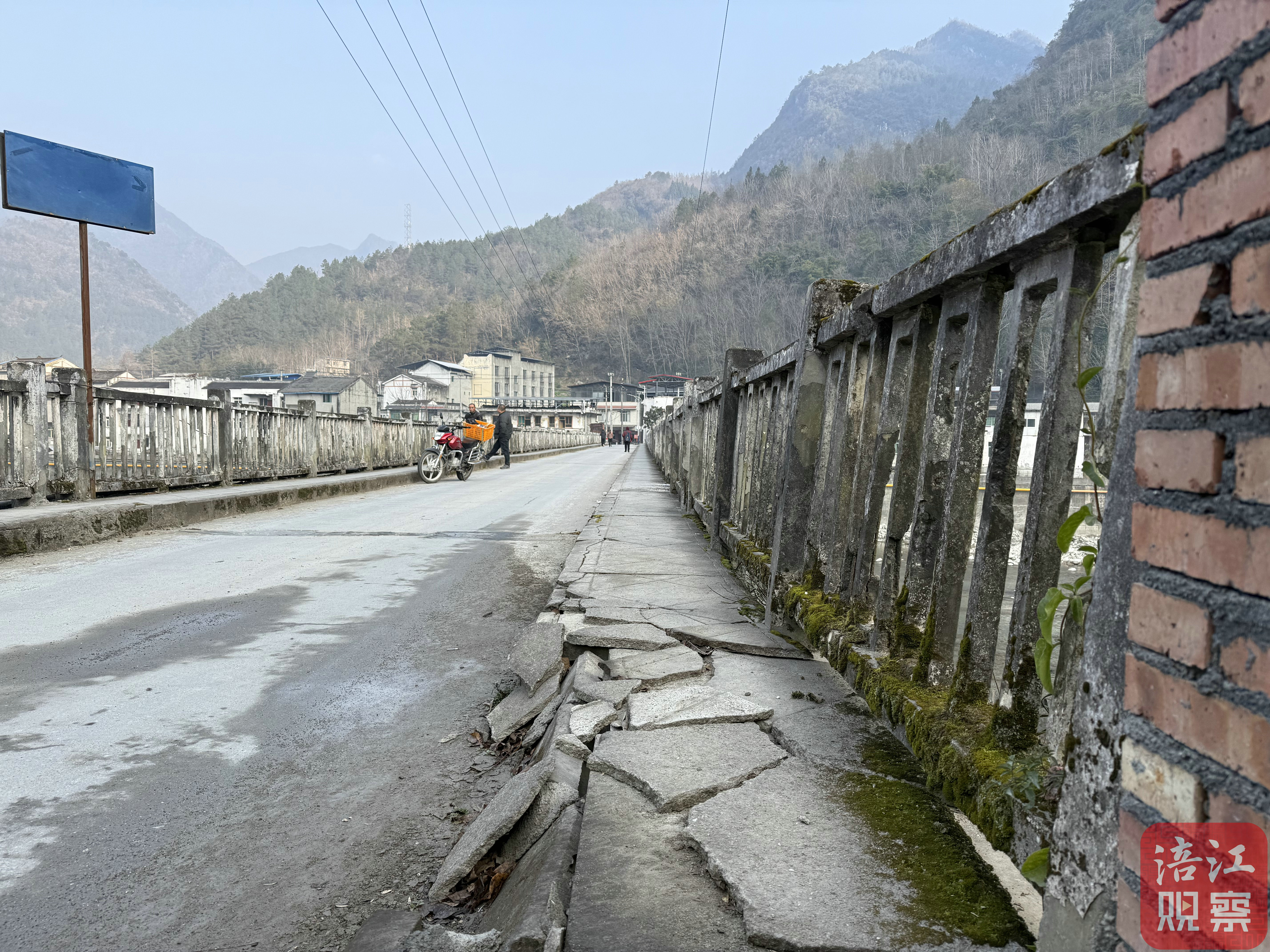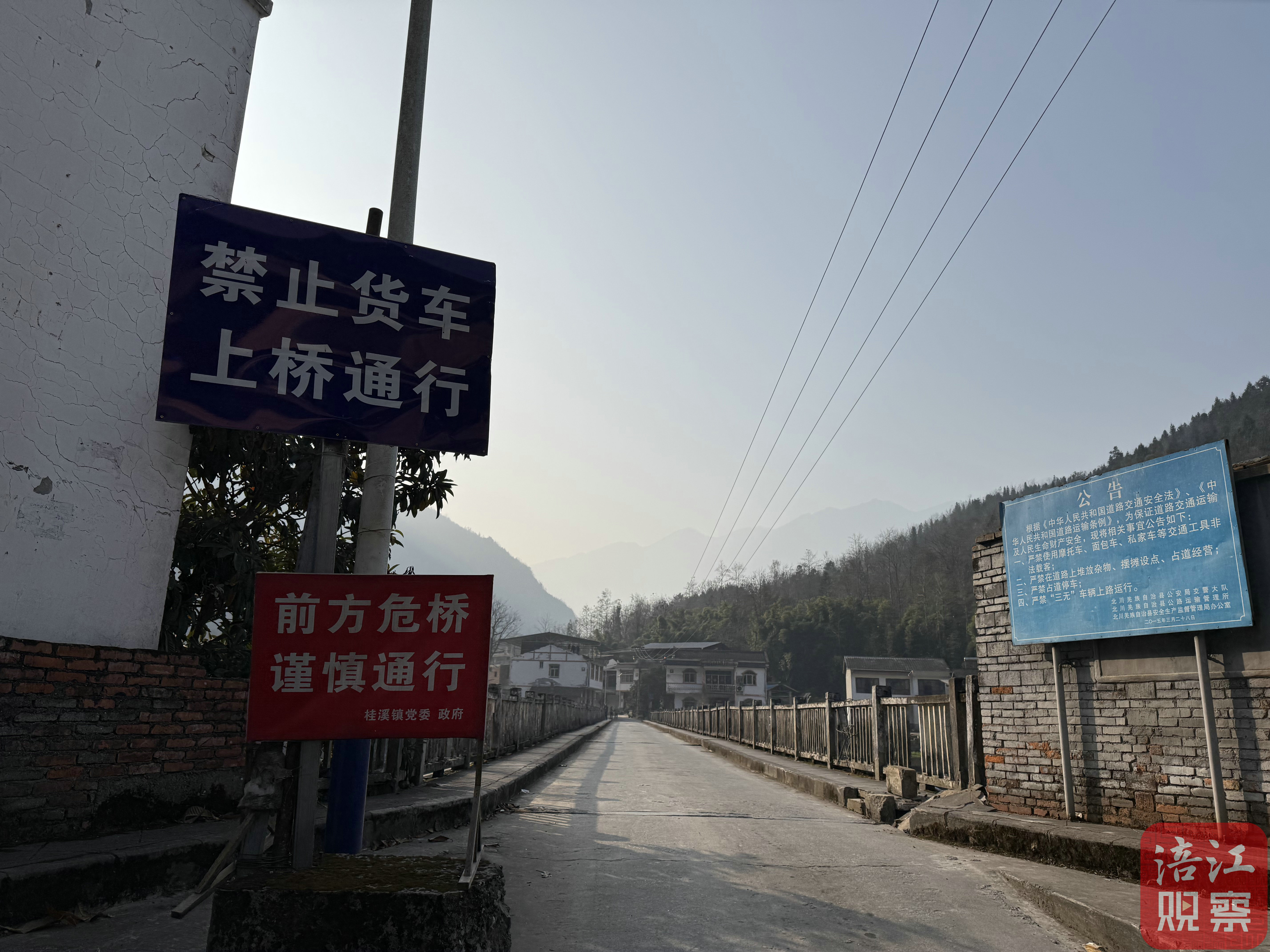 12月29日,记者前往实地探访看到,该桥横跨河流,长约80米,桥面破损严重,部分护栏缺失,桥头两侧醒目地放置着“危桥危险 谨慎通行”“前方危桥 货车禁行”等警示标识。“桥上有车的时候,我们就赶紧跑到桥两头来,担心突然断了,希望这个桥能快点修好,让大家能安心走。”采访中,不少村民向记者表达了担忧。