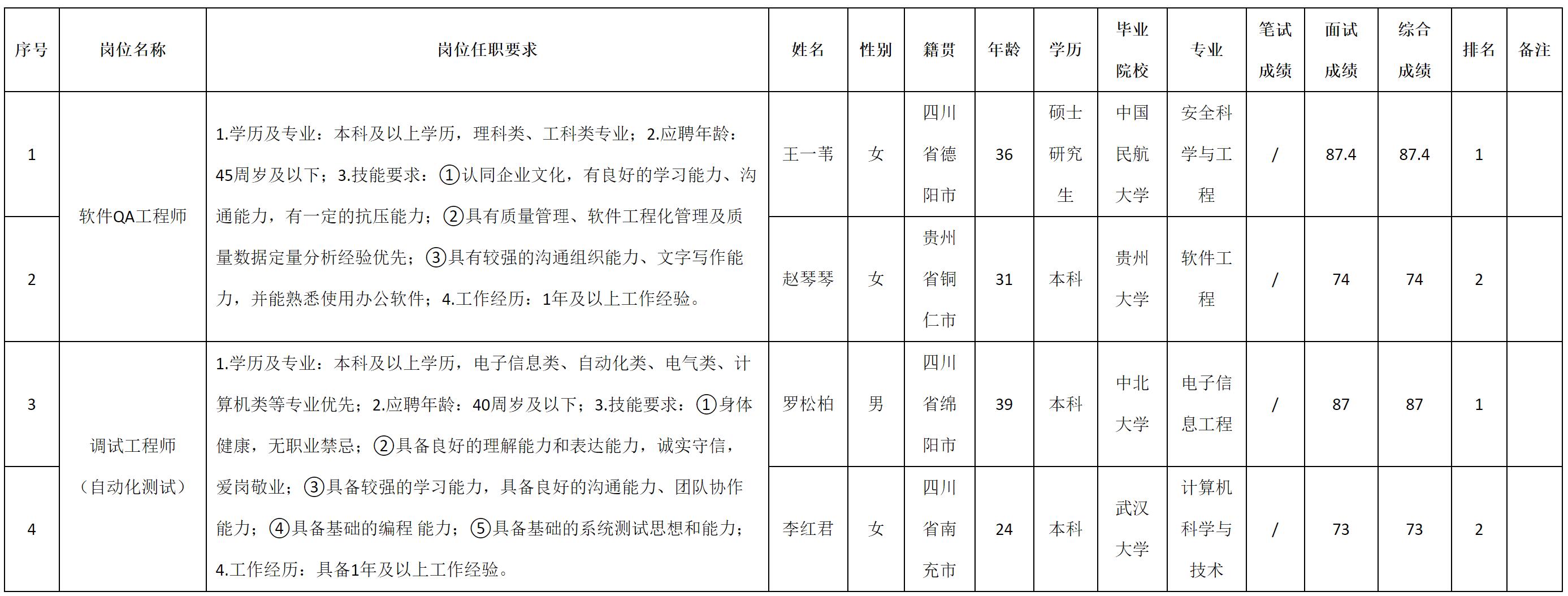 根据四川九洲电器集团有限责任公司发布的招聘公告及招聘相关规定,现将测试成绩予以公示。