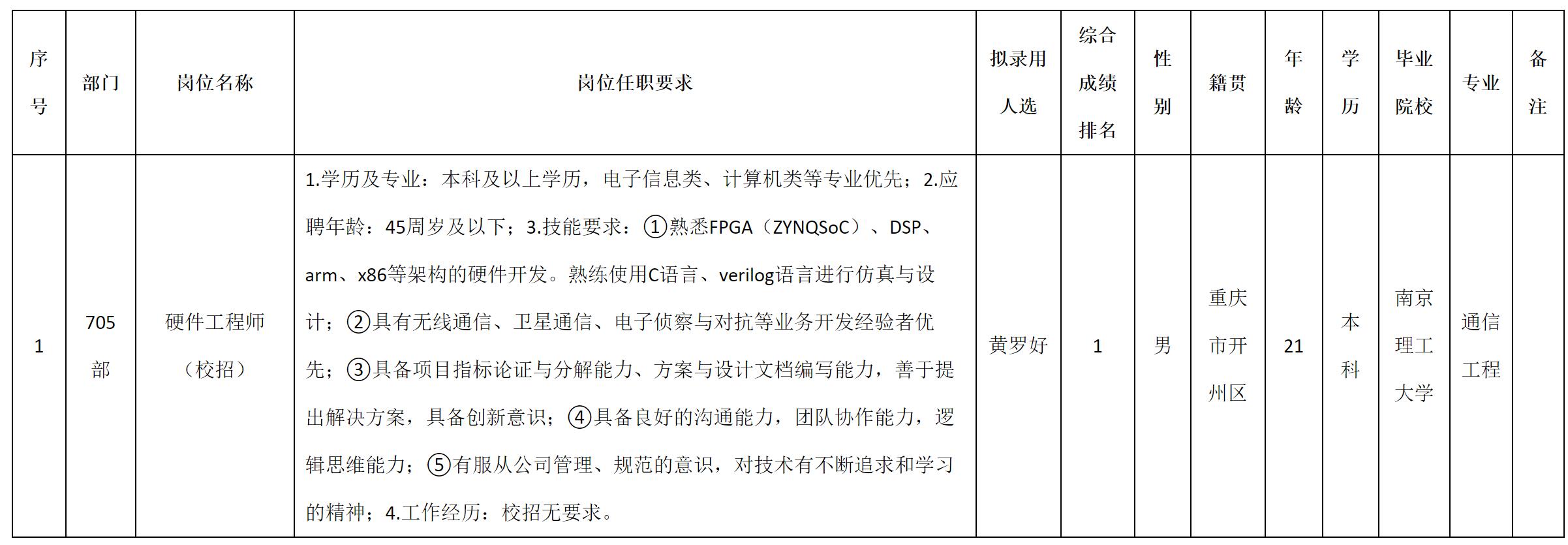 根据四川九洲电器集团有限责任公司发布的招聘公告及招聘相关规定,经测试、考察、体检等程序,拟录用黄罗好同志到四川九洲电器集团有限责任公司工作,现予以公示,具体情况如下:
