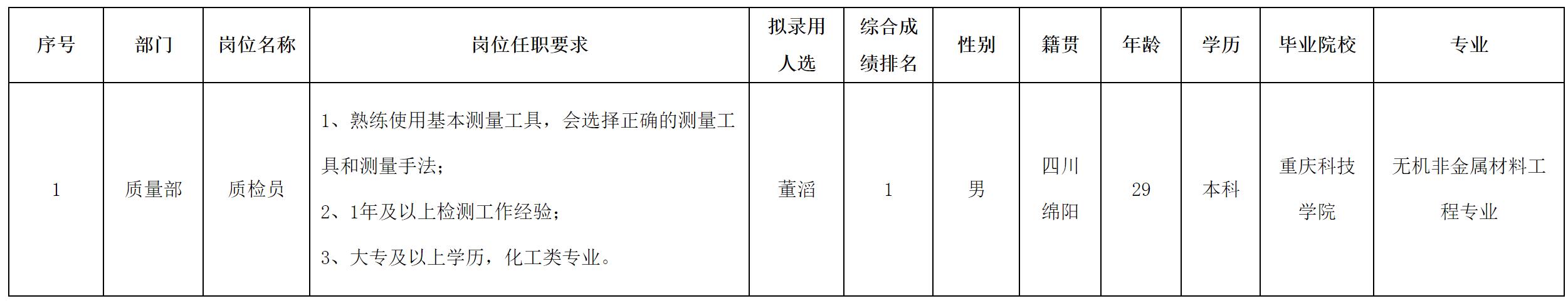 根据四川长虹新材料科技有限公司发布的招聘公告及招聘相关规定,经面试、考察、体检等程序,拟录用董滔同志到四川长虹新材料科技有限公司工作,现予以公示,具体情况如下: