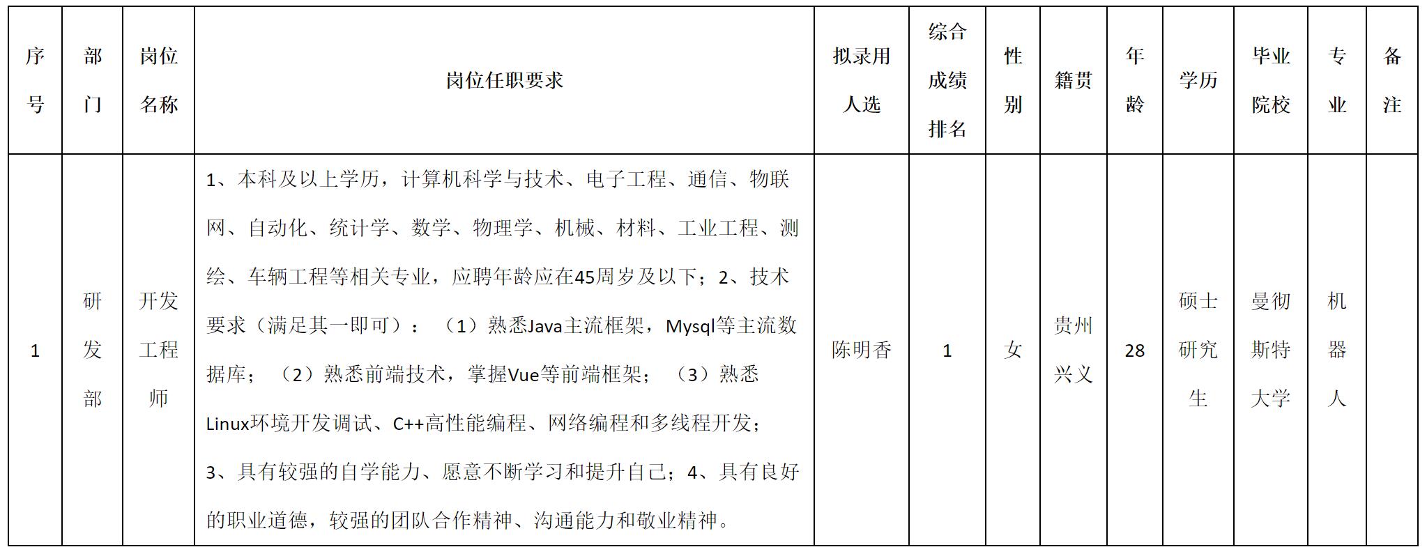 根据四川九洲投资控股集团有限公司软件与数据智能军团发布的招聘公告及招聘相关规定,经测试、考察、体检等程序,拟录用陈明香同志到四川九洲投资控股集团有限公司软件与数据智能军团工作,现予以公示,具体情况如下: