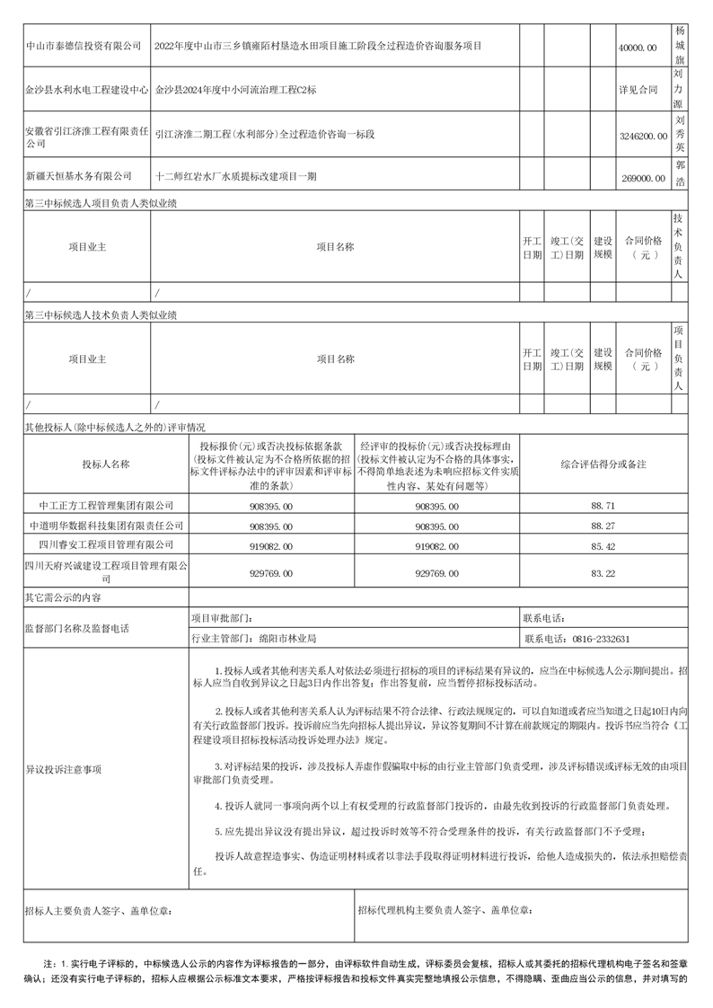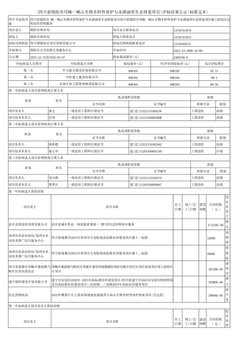 四川省绵阳市邛崃—岷山生物多样性保护与水源涵养生态修复项目)评标结果公示