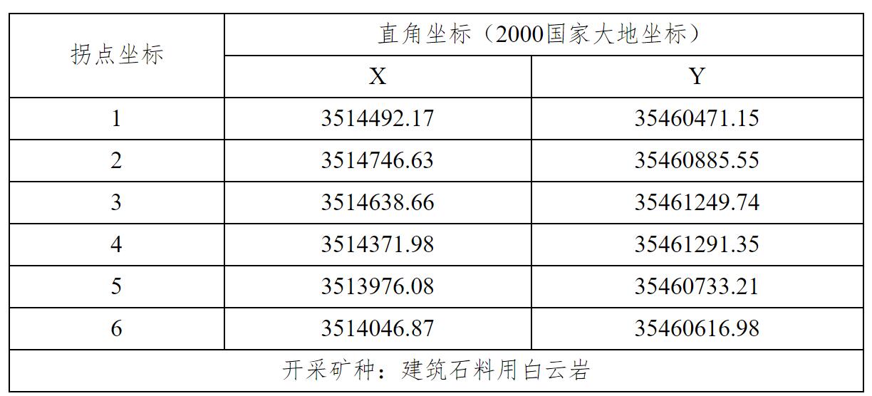 由6个拐点坐标圈闭(见下表),矿区总面积:0.3922平方公里,开采标高:+1017.3m至+787m