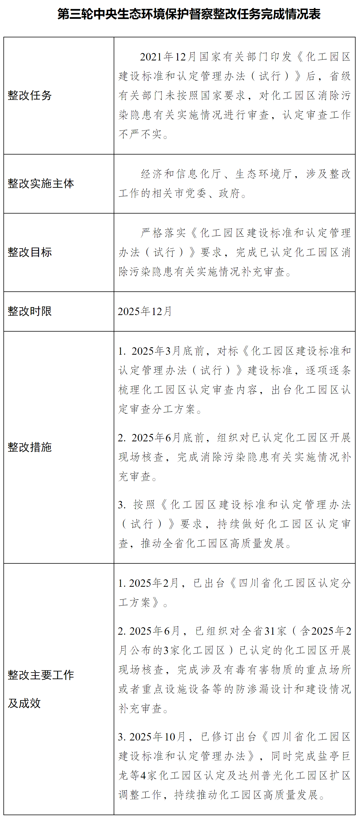 第三轮中央生态环境保护督察“化工园区消除污染隐患实施情况审查”整改任务已完成,并通过验收,拟按程序实施销号。根据《四川省生态环境保护督察问题整改销号办法(2025修订)》有关要求,现将该项任务整改验收情况予以公示,公示期为2025年12月31日至2026年1月14日(十个工作日)。公示期间如有异议,请实名书面向四川省经济和信息化厅提出。