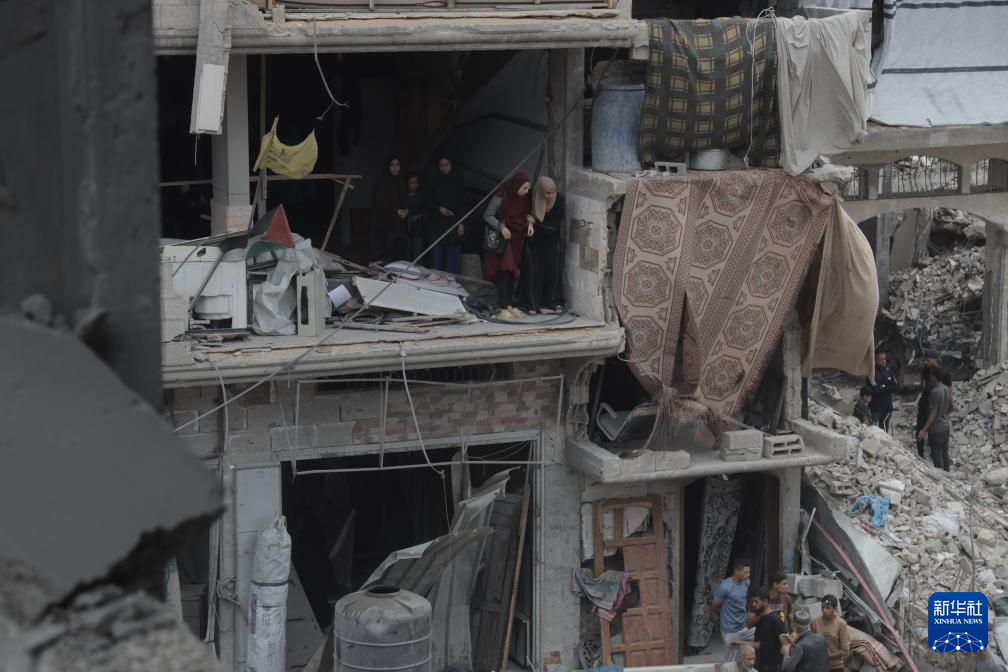 5月15日,在加沙地带北部杰巴利耶难民营,巴勒斯坦人查看以军轰炸后的建筑废墟。新华社发(阿卜杜勒·拉赫曼·萨拉马摄)