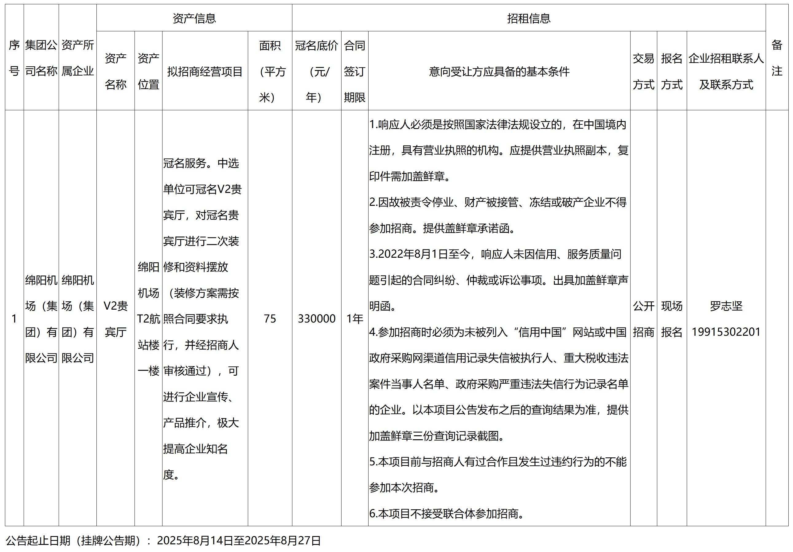 绵阳机场(集团)有限公司贵宾厅冠名招商公告