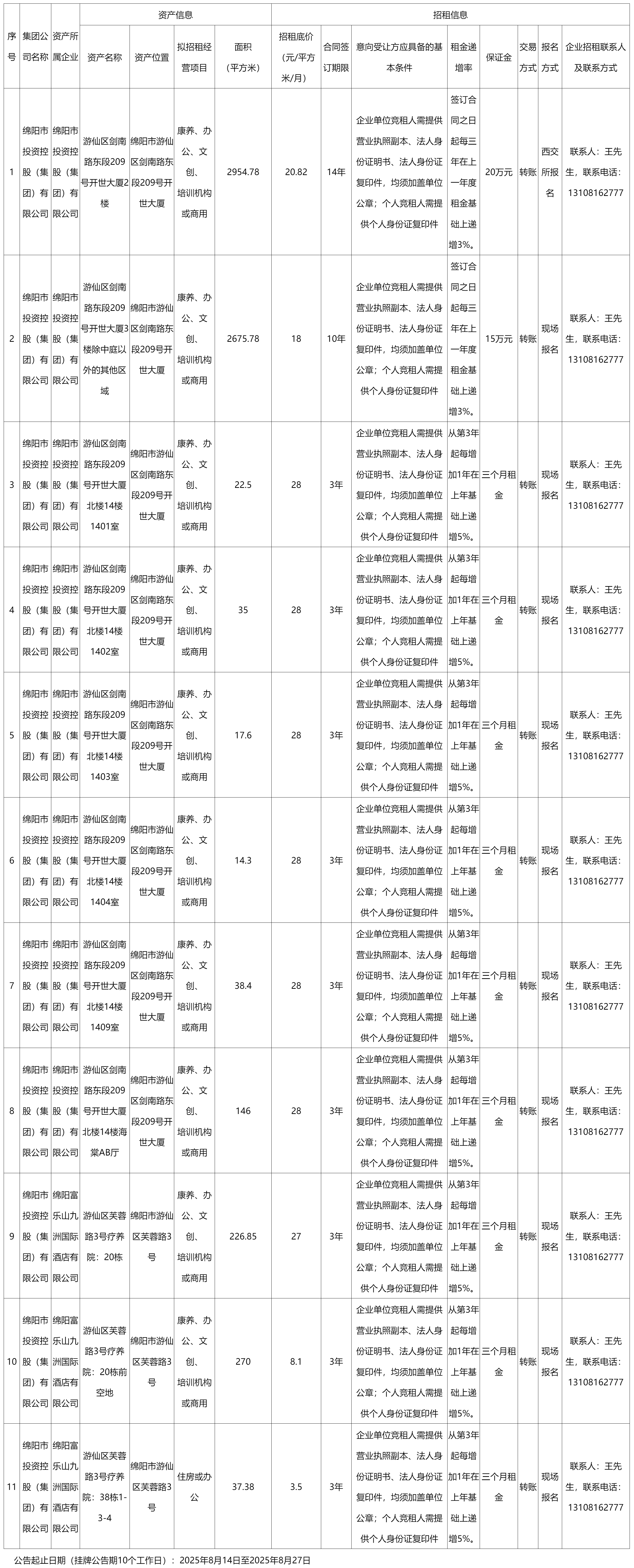 绵阳富乐山九洲国际酒店有限公司资产出租公告