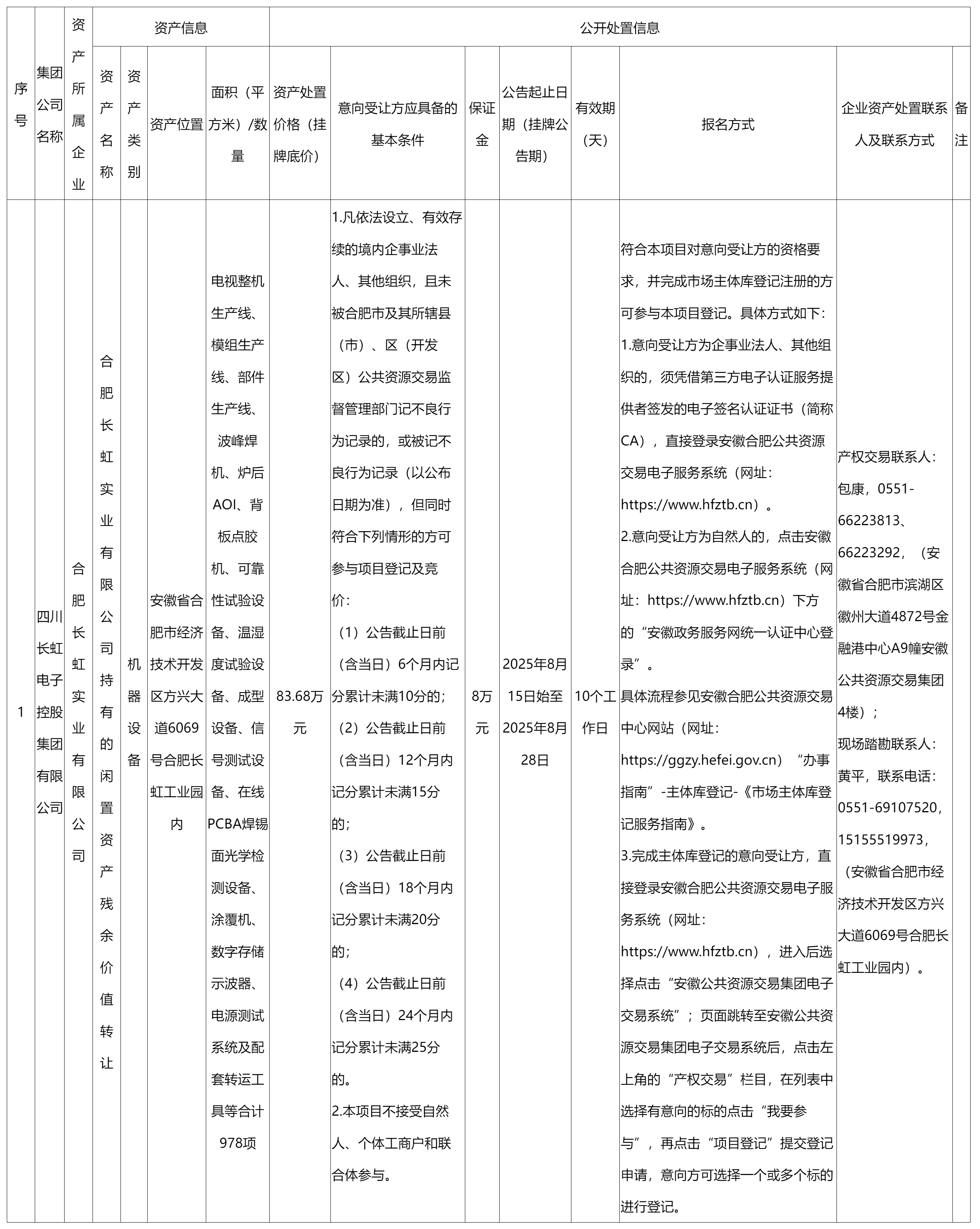 合肥长虹实业有限公司闲置资产处置公告
