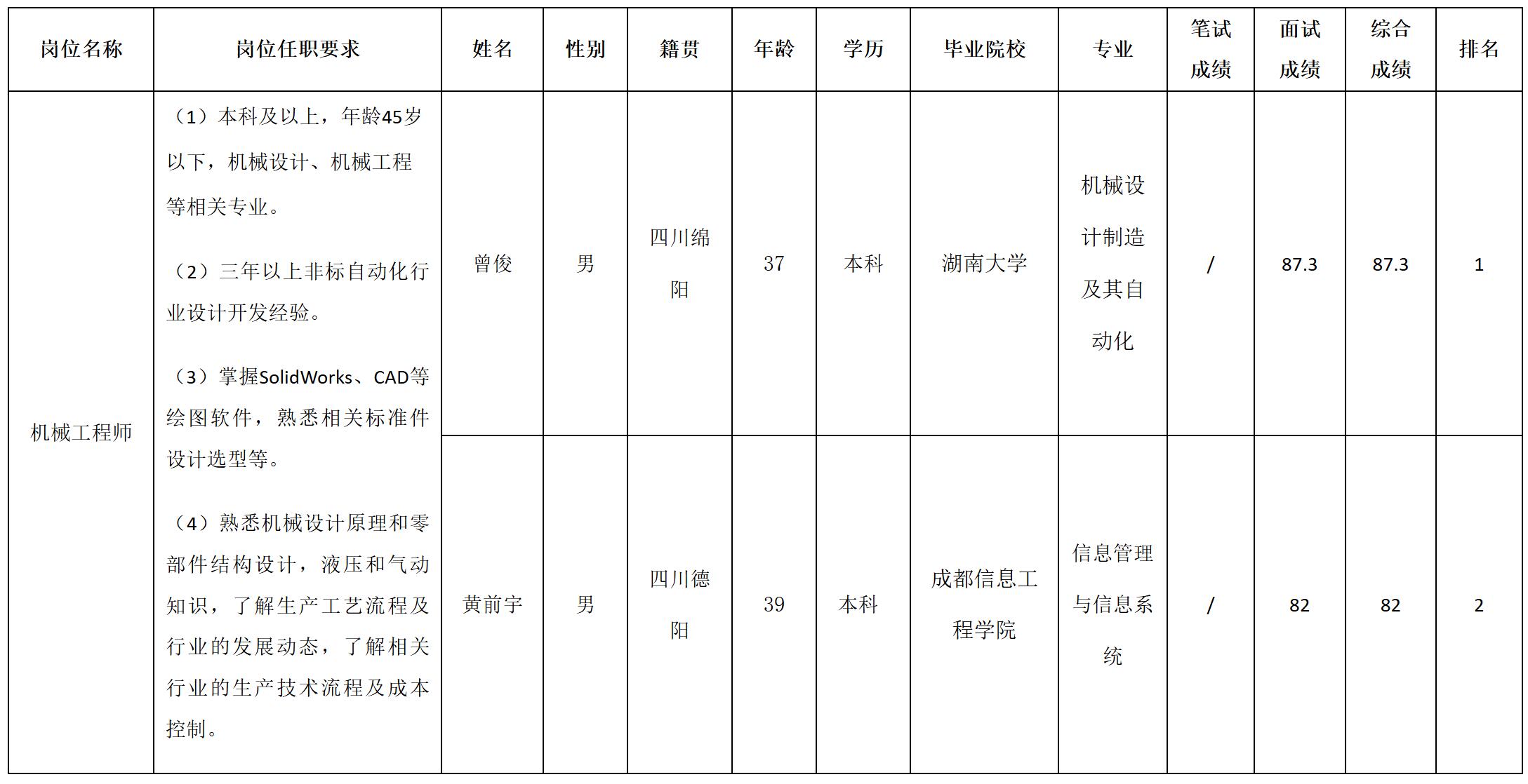 根据四川长虹智能制造技术有限公司发布的招聘公告及招聘相关规定,经面试等程序,现将面试成绩予以公示。