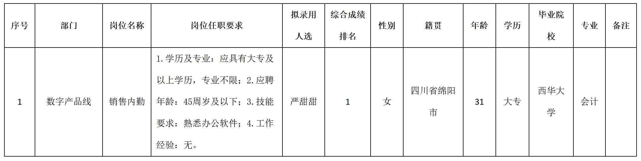 根据四川九州光电子技术有限公司发布的招聘公告及招聘相关规定,经笔试、面试、考察、体检等程序,拟录用严甜甜同志到四川九州光电子技术有限公司工作,现予以公示,具体情况如下: