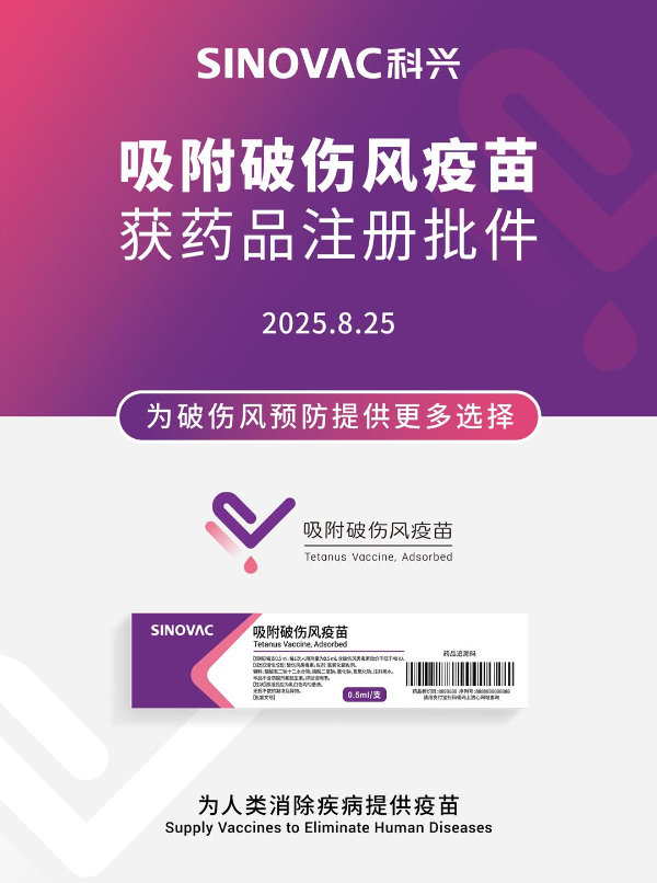 8月25日,北京科兴控股(集团)有限公司旗下北京科兴中维生物技术有限公司研制的吸附破伤风疫苗获得国家药品监督管理局颁发的《药品注册批件》(批准文号:国药准字S20250048),将为破伤风预防提供更多选择。