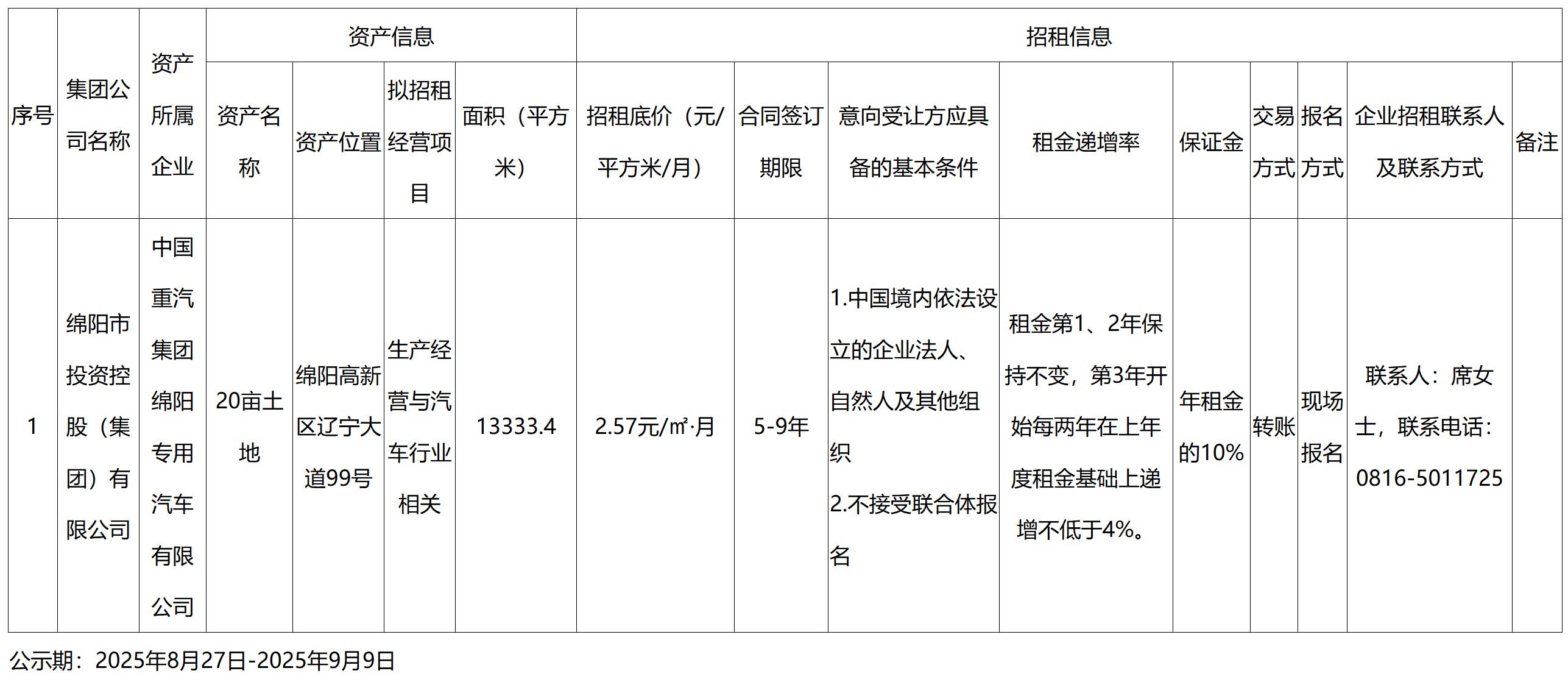中国重汽集团绵阳专用汽车有限公司资产出租公告