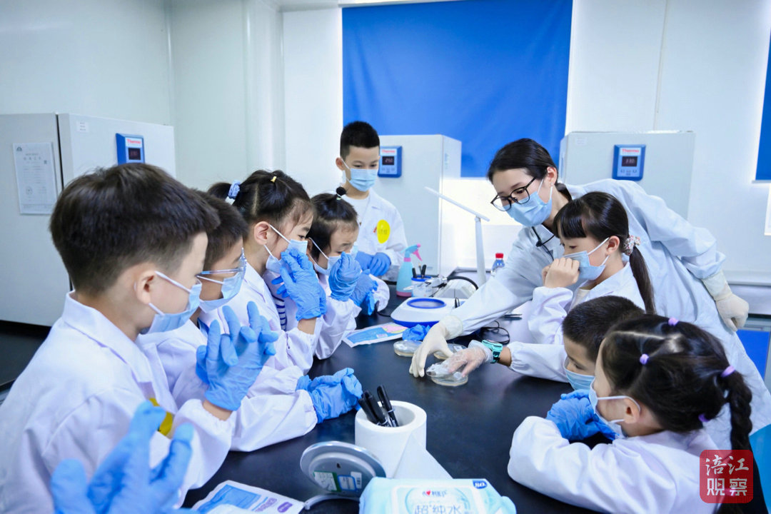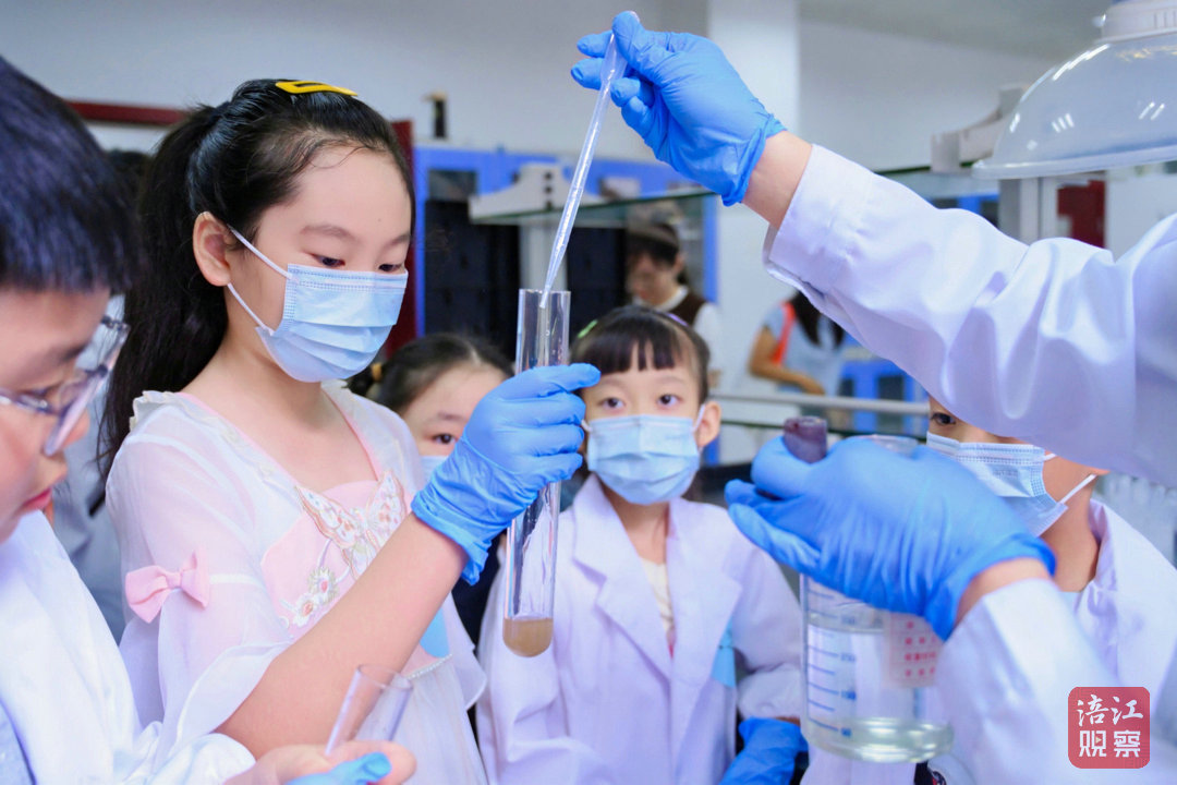 随后,在检验实验室,专业人员带领小朋友们亲自动手,进行“制作镜子”“会变色的字”等实验。孩子们围在实验台前积极参与,认真观察,不时举手提问,好奇心与求知欲被充分激发。