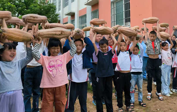 该校校园种植园里,金灿灿的南瓜、胖乎乎的冬瓜、沉甸甸地挂满藤蔓,绿油油的空心菜在阳光下闪耀着收获的喜悦。