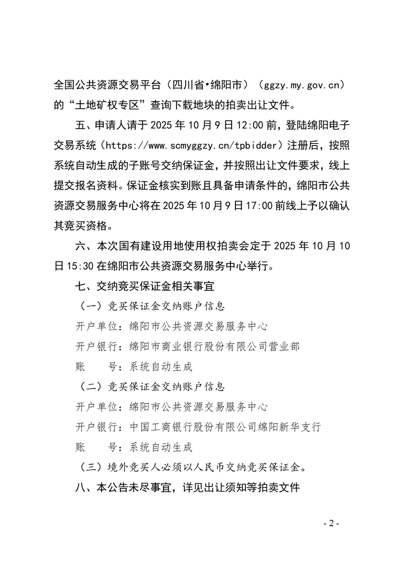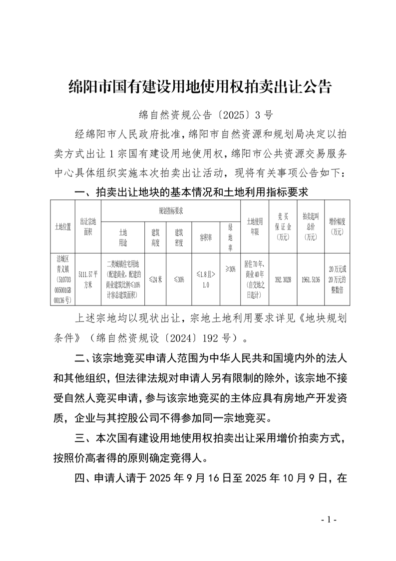 绵阳市国有建设用地使用权拍卖出让公告(绵自然资规公告〔2025〕3号)