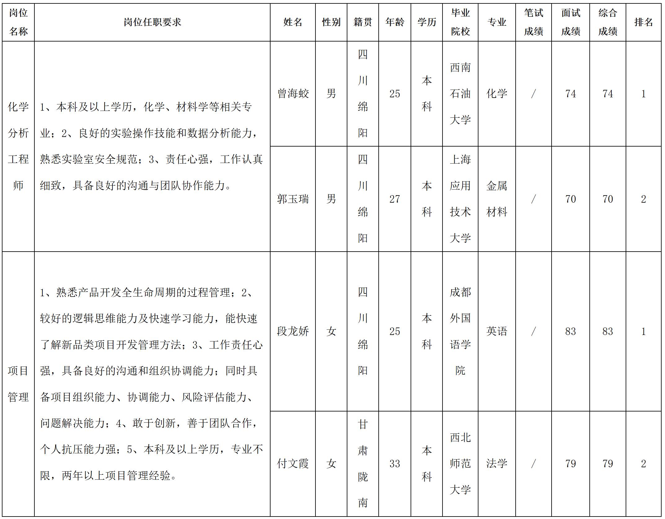 根据四川华丰科技股份有限公司发布的招聘公告及招聘相关规定,经笔试、面试等程序,现将笔试(面试)成绩予以公示。