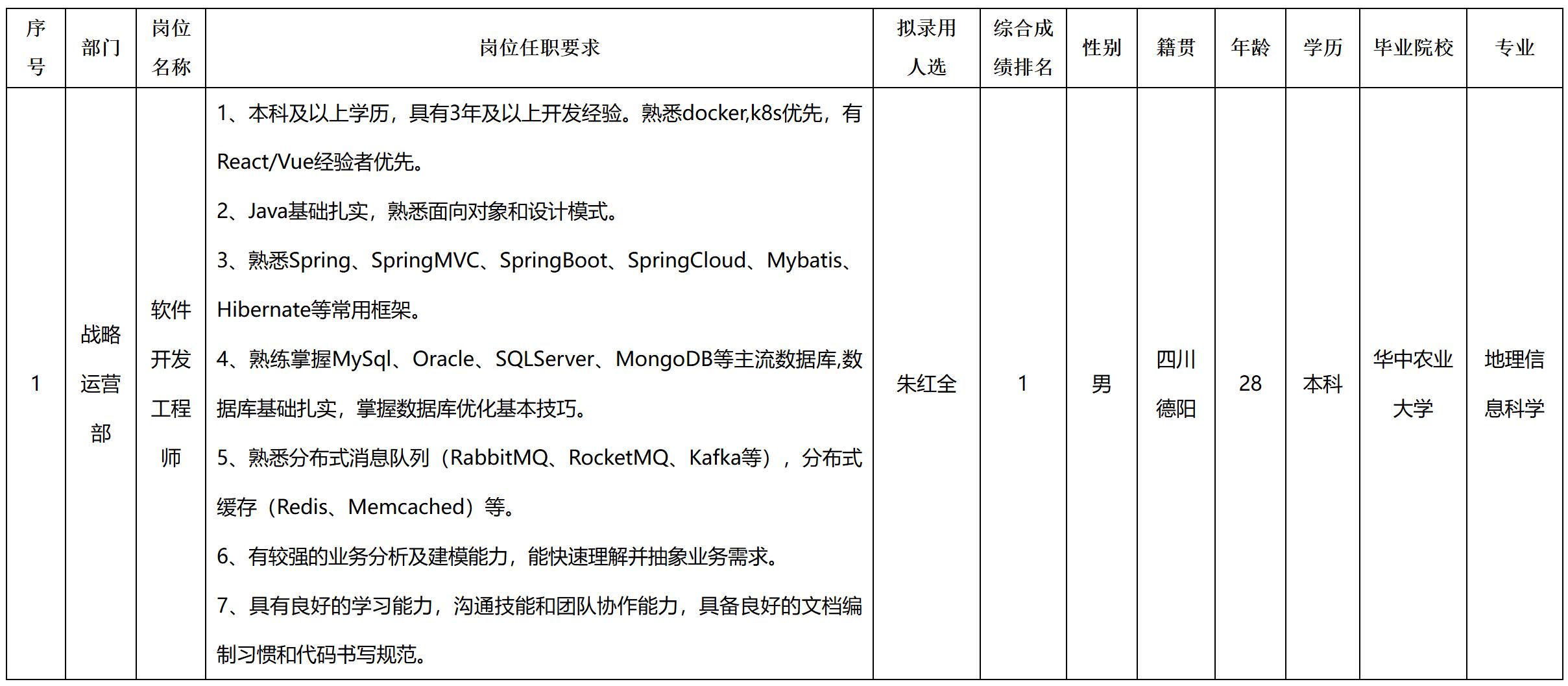 根据四川华丰科技股份有限公司发布的招聘公告及招聘相关规定,经面试等程序,拟录用朱红全同志到四川华丰科技股份有限公司工作,现予以公示,具体情况如下: