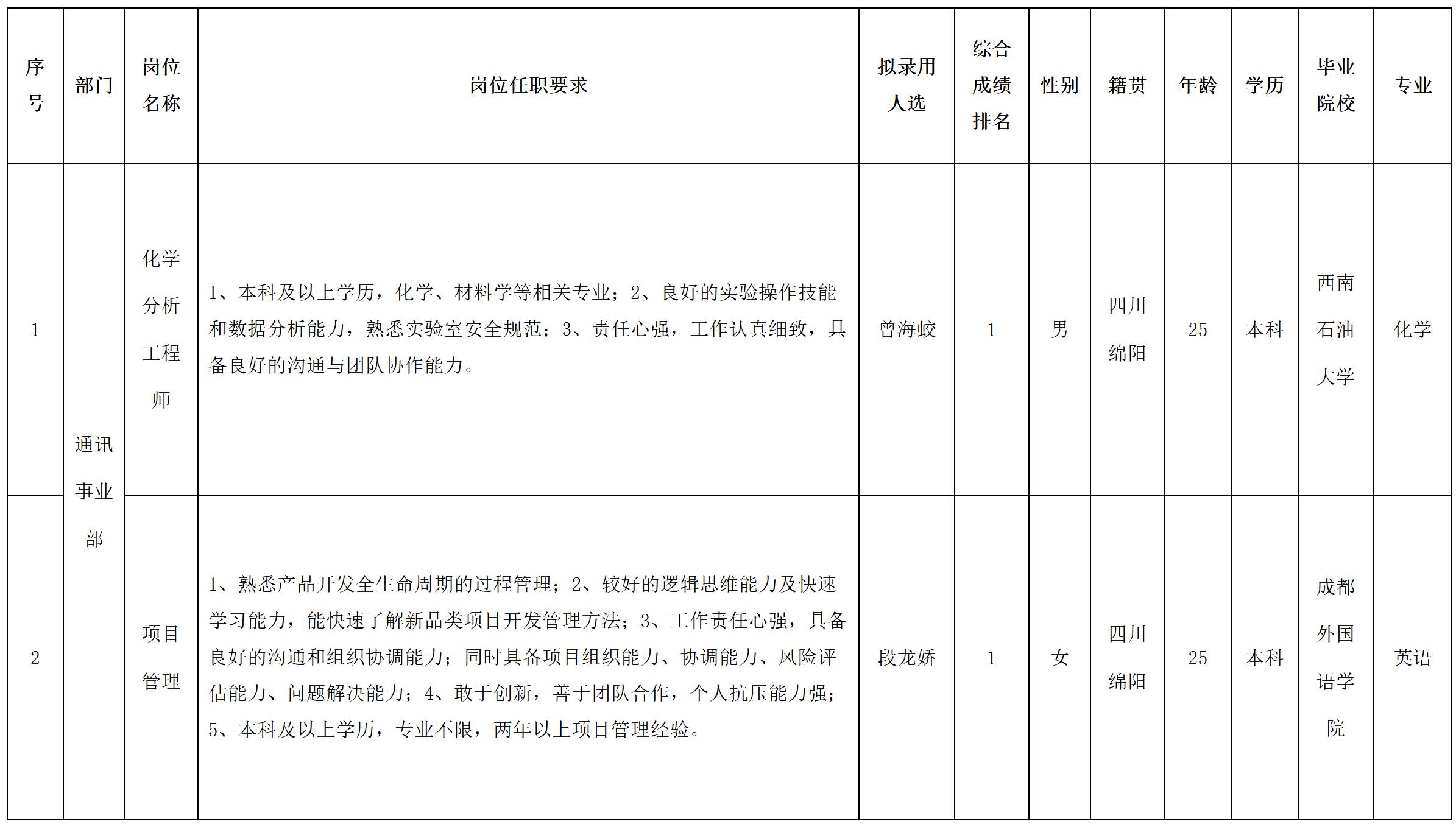 根据四川华丰科技股份有限公司发布的招聘公告及招聘相关规定,经面试等程序,拟录用曾海蛟等同志到四川华丰科技股份有限公司工作,现予以公示,具体情况如下:
