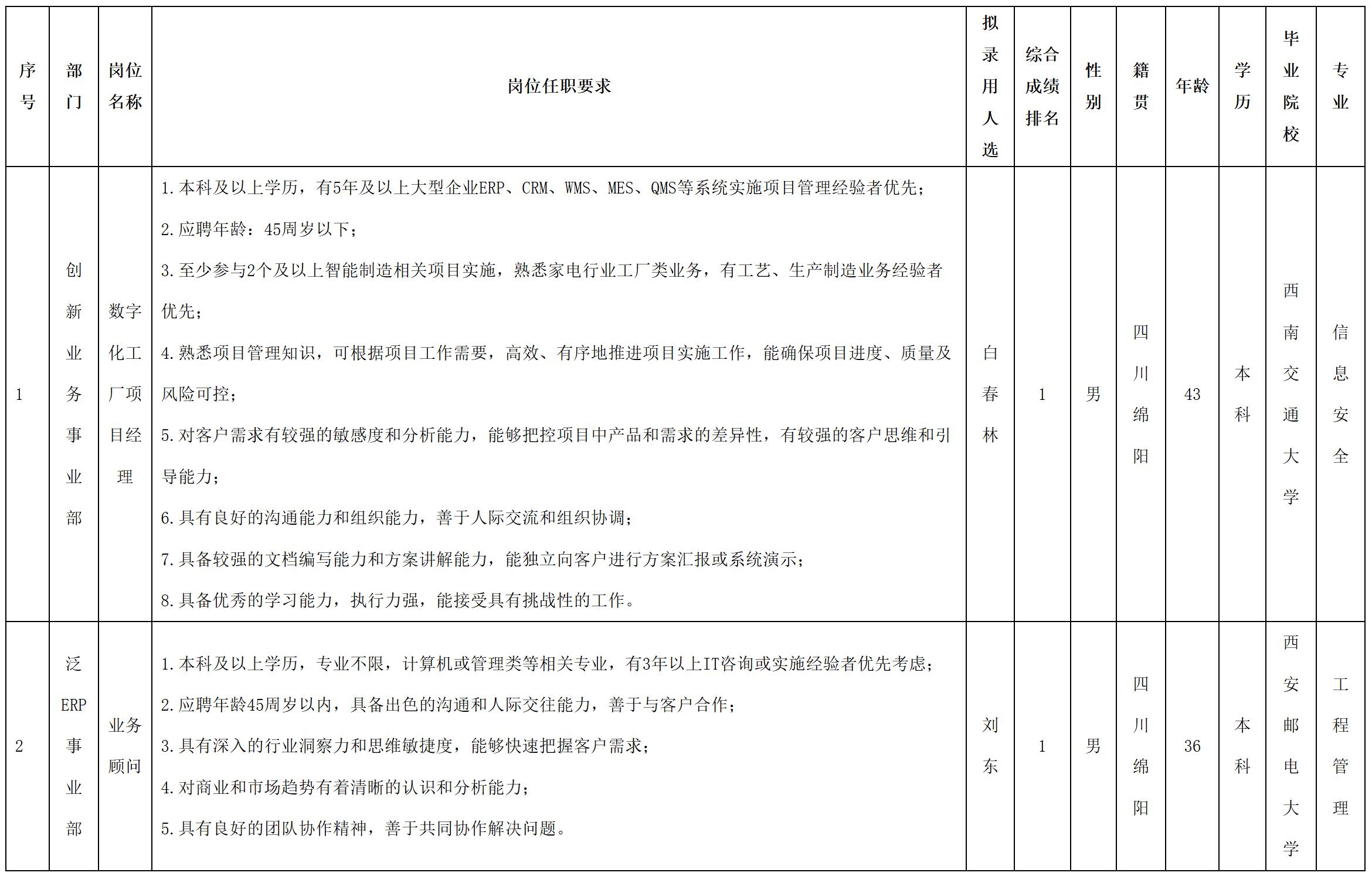 根据四川虹信软件股份有限公司发布的招聘公告及招聘相关规定,经面试、考察、体检等程序,拟录用白春林、刘东同志到四川虹信软件股份有限公司工作,现予以公示,具体情况如下: