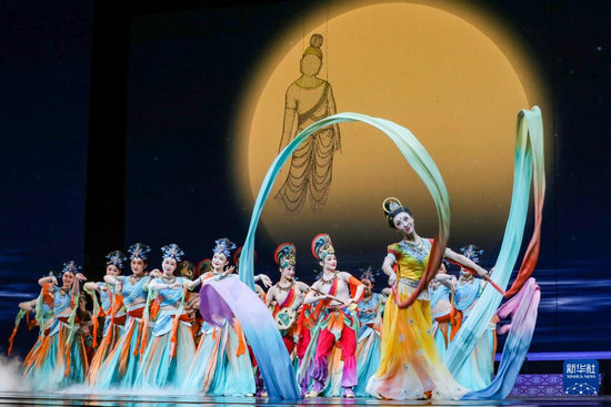 9月20日晚,演员在敦煌大剧院表演新版《丝路花雨》。