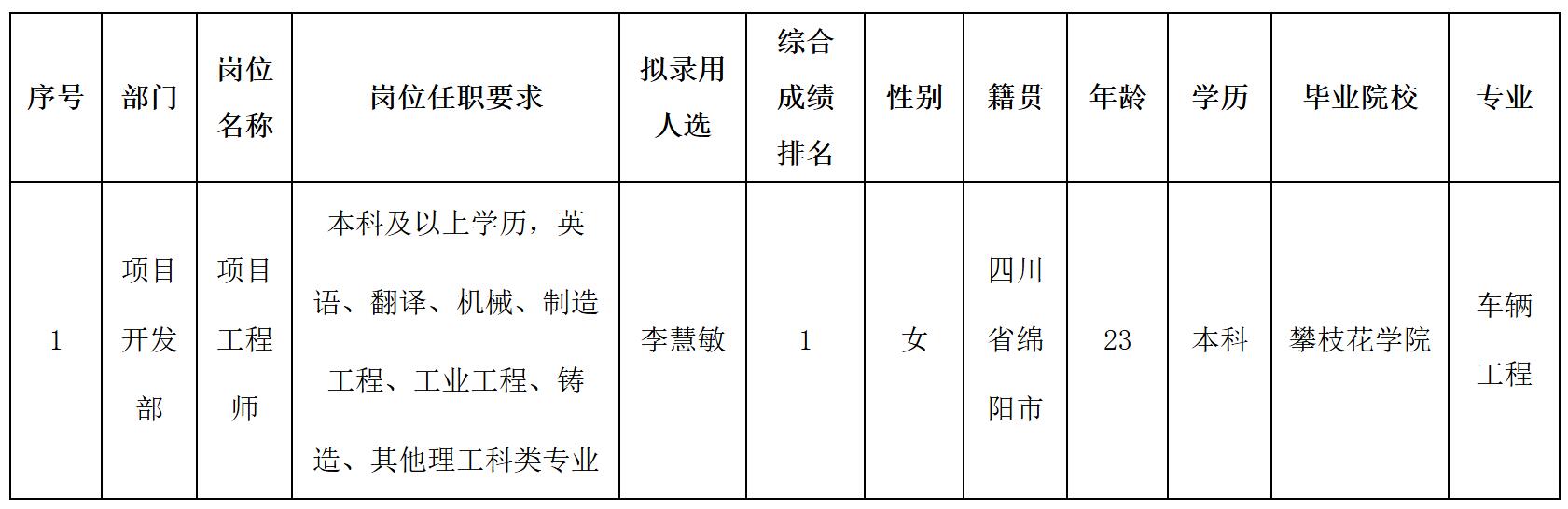 根据四川波鸿实业有限公司发布的招聘公告及招聘相关规定,经面试、体检等程序,拟录用李慧敏同志到四川威斯卡特工业有限公司绵阳分公司工作,现予以公示,具体情况如下: