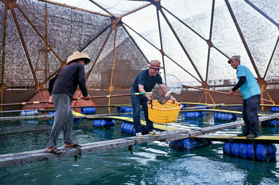 图为养殖户在“定海湾2号”上捕捞大黄鱼。(吴丹 摄)