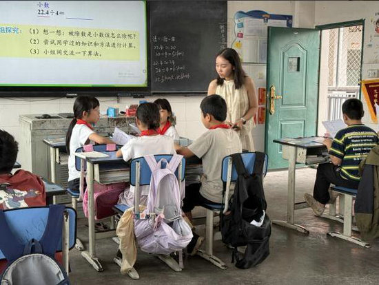 李老师五年级《小数的除法》教学则凸显了对知识逻辑与学生差异的关注。教师以“整数除法算理”为铺垫,通过“问题导入—对比探究—分步拆解”的清晰思路,精准突破“商的小数点与被除数小数点对齐”这一核心难点。同时,课堂设计了基础计算、实际应用题等分层练习,兼顾不同学习水平学生;更通过小组讨论引导学生自主总结算法,在掌握知识的同时,有效培养了逻辑思维与合作能力。小组讨论气氛热烈,小组代表汇报发言中,小组长声音清晰、洪亮,展现出良好的学生们合作意识与问题解决能力。