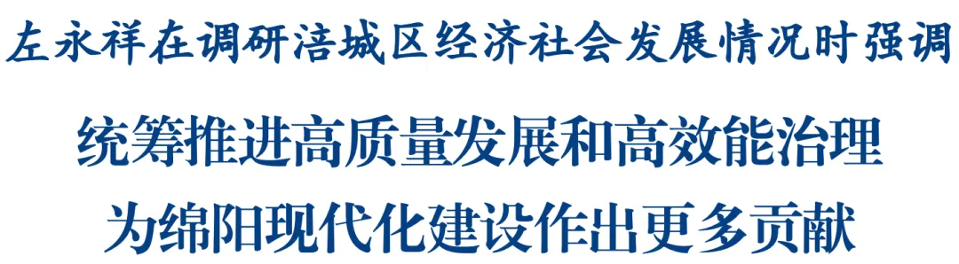调研中,左永祥听取了涪城区经济社会发展情况汇报,对各项工作取得的成效表示肯定。他强调,涪城区作为绵阳主城区和经济发展主战场,要保持战略定力、坚定发展信心,进一步补短板、锻长板、扬优势,推动各项工作迈上新台阶。要稳定工业发展良好势头,积极培育和发展新质生产力,塑造高质量发展新动能新优势;着力提高服务业发展能级,抢抓“金九银十”黄金时机,精心办好系列主题消费活动,加大房地产促销力度,推动消费扩容提质;突出抓好项目投资,积极谋划一批大项目、好项目,加快形成更多投资额和实物工作量;统筹抓好安全生产和社会稳定等工作,筑牢高质量发展安全底线。当前已临近四季度,要拿出时不我待的精神状态,全力以赴拼经济搞建设,确保完成全年目标任务,顺利实现“十四五”圆满收官;同时,要前瞻谋划“十五五”时期经济社会发展,科学确定目标任务、思路举措和实施路径,推动经济实现质的有效提升和量的合理增长。