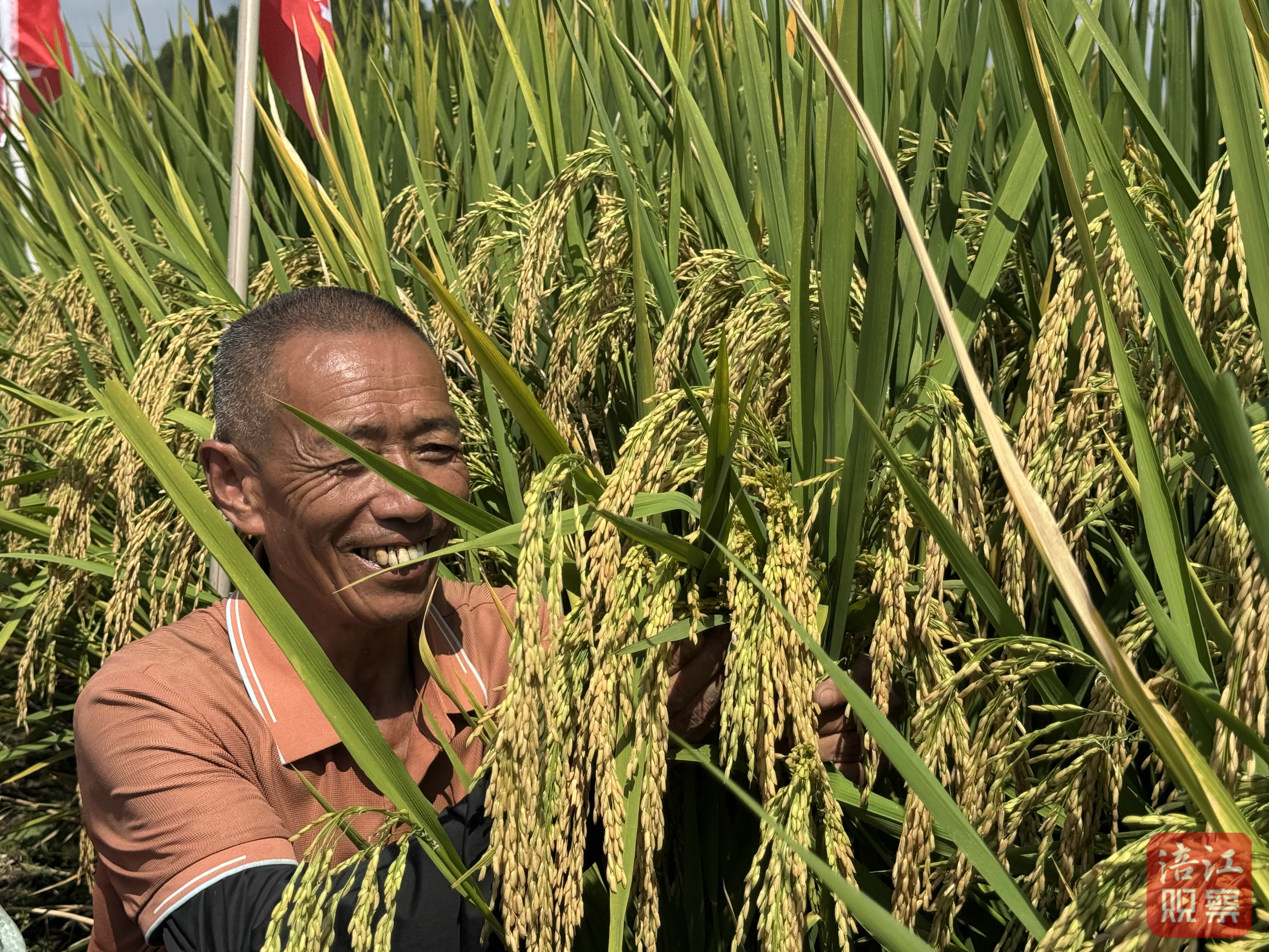 收割机轰鸣声中,种植大户何新捧起沉甸甸的稻穗,指尖轻捻饱满的谷粒,笑容如秋阳般灿烂:“这‘飓两优8612’品种穗头压得弯弯的,真是好种出好粮!”
