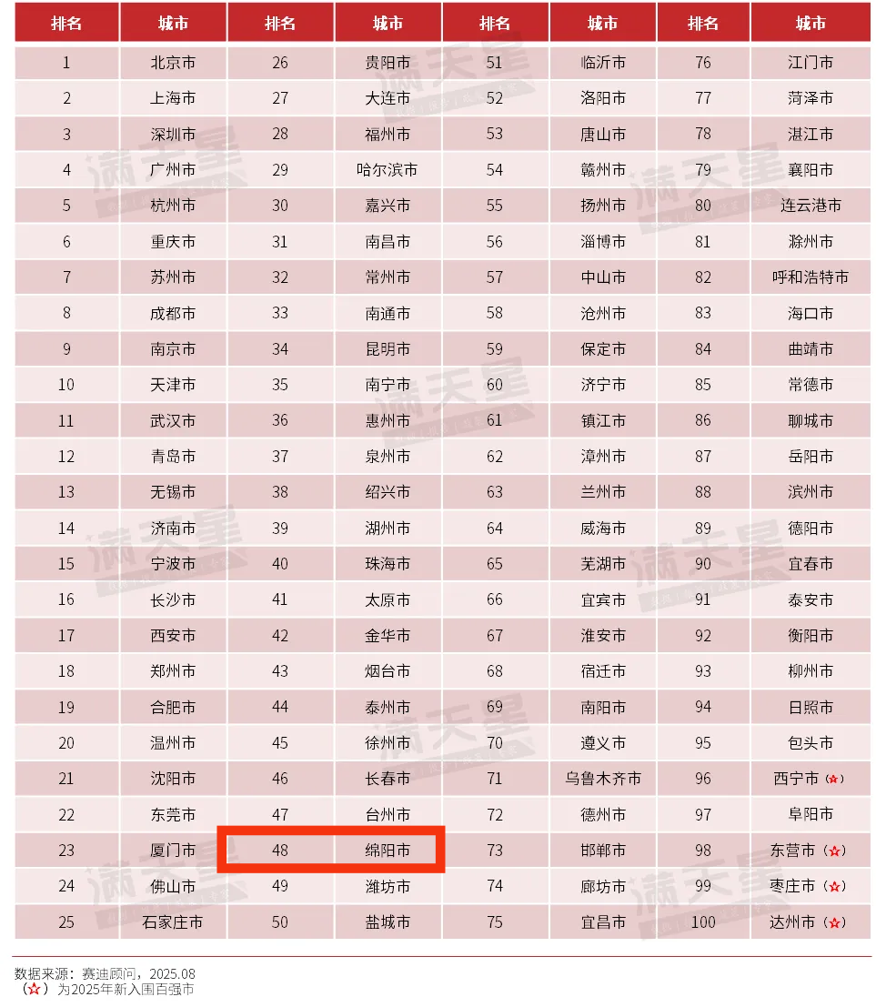 9月25日,赛迪顾问发布《2025年中国数字城市竞争力研究报告》,2025年数字百强市名单出炉,绵阳位列第48位,较2024年上升2位,位居全省第2,仅次于成都。