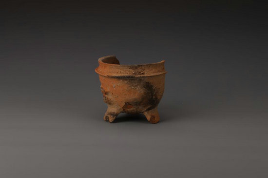 斗山遗址出土的马家浜文化时期的陶鼎。(江苏省文物考古研究院供图)
