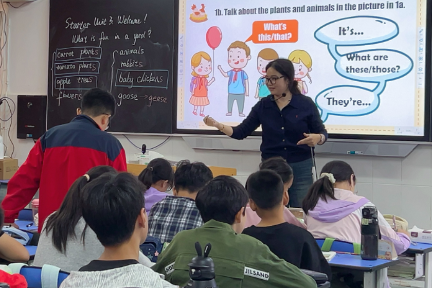 文雨薇老师注重语言的实际运用,通过创设真实情境引导学生理解和运用新知。文老师的课堂以“任务驱动”为主线,设计了丰富多彩的教学活动,引导学生听音猜动物、看图猜植物,迅速激发了学生的兴趣。设计了角色扮演活动,课堂互动性十足。在练习环节,她采用了游戏化的教学方式,如数字游戏、快速抢答等,使学生在轻松愉快的氛围中掌握了如何用英语询问和描述动植物的数量。