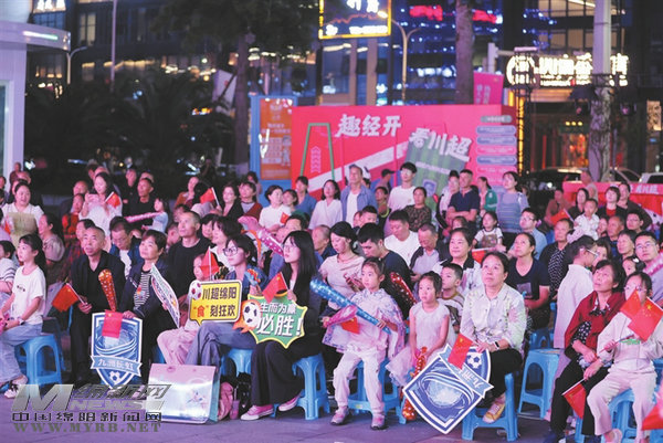 在经开区城南vv街举办的开街活动中,将川超绵阳队首场比赛转播作为开街活动的重要节目,众多群众现场观赛,为绵阳队加油。经开区经发局工作人员罗成杰说,川超活动期间,商户将依托川超活动,开展各类促消费活动,为川超加油助力,进一步推动经开区人气聚集,商气活跃,提升三江湖畔消费品牌。