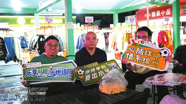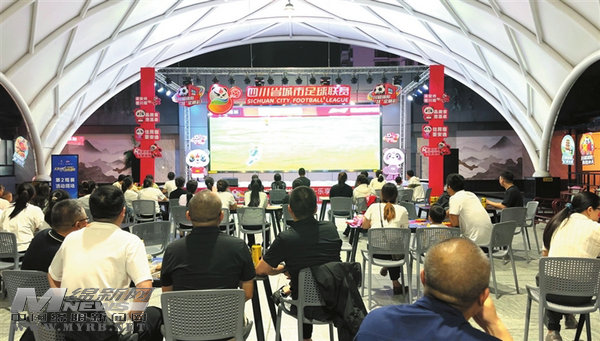 在三台县东方时代广场,足球元素随处可见,街区入口和通道两侧,“乐享川超 当燃绵阳”的绿茵主题旗帜迎风飘扬。东方时代广场二期负责人魏梅介绍:“我们准备了20套露营桌椅,可以容纳100名球迷一起观赛。”虽然天空飘着细雨,但这里依然聚满了前来助威的市民。每一次进攻、每一脚射门,都牵动着大家的心,整个商业街区变成一场盛大的露天观赛派对!市民鲜明兴奋地说:“三台足球氛围一直很浓,今天绵阳队一开场气势就很足,非常有看头!”