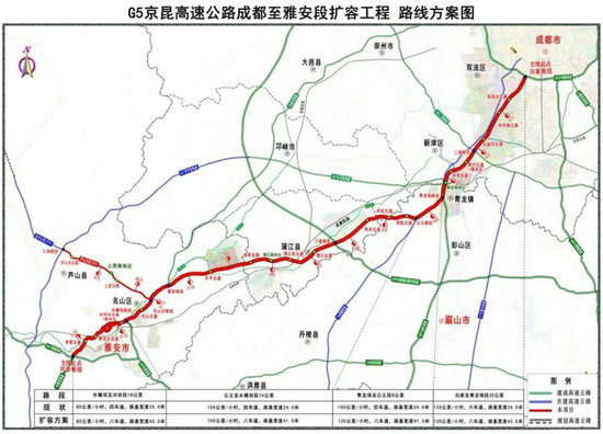 成雅高速扩容项目,路线全长159.1公里(成雅高速主线长134.7公里,芦山支线长24.4公里),估算投资297.6亿元,计划工期4年。路线起于成都绕城高速白家枢纽互通,经成都市双流区、新津区,眉山市彭山区、东坡区,成都市邛崃市、蒲江县,雅安市名山区,止于雨城区对岩枢纽互通,与雅西高速和雅康高速公路衔接,同时在名山区设支线经雨城区连接至芦山县,与在建的邛崃经芦山至荥经高速公路相接。