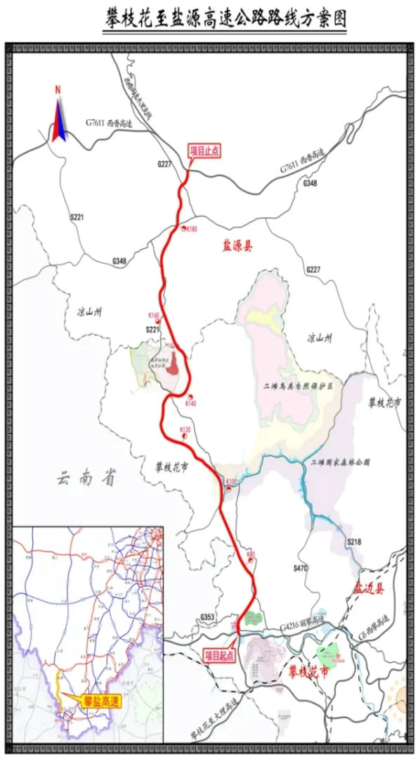 攀盐高速公路是《四川省高速公路网布局规划(2022—2035年)》中13条纵线之一“班玛经色达至攀枝花高速公路”重要组成路段,也是G4216丽江至攀枝花、G7611西昌至香格里拉两条国家高速公路的联络线,项目概算总投资约343.4亿元,预计建设工期6年。建成后,将实现与西香高速、蓉丽高速、攀大高速、京昆高速四条区域交通动脉的有机衔接,彻底改变攀枝花北部地区不通高速的历史。届时,攀枝花市区到盐源县的车程将由原来的5小时缩短至约2个小时。