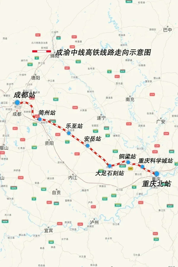 成渝中线高铁线路走向(图片来源:中国铁路微信公众号)