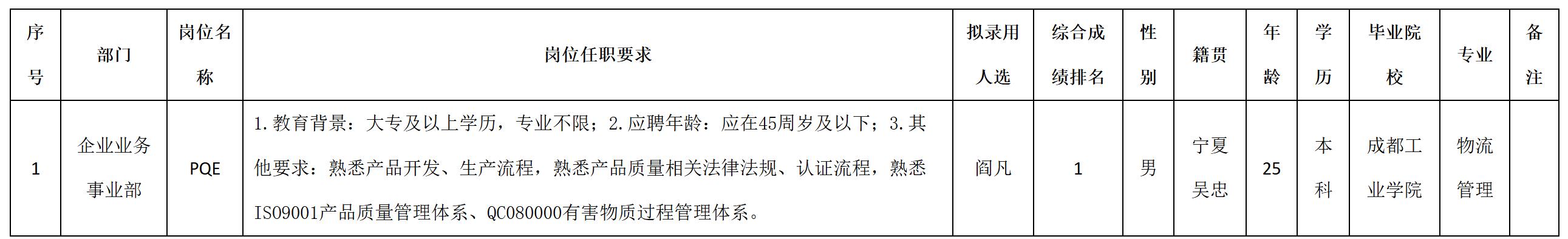 根据四川九州电子科技股份有限公司发布的招聘公告及招聘相关规定,经笔试、面试、考察、体检等程序,拟录用阎凡同志到四川九州电子科技股份有限公司工作,现予以公示,具体情况如下: