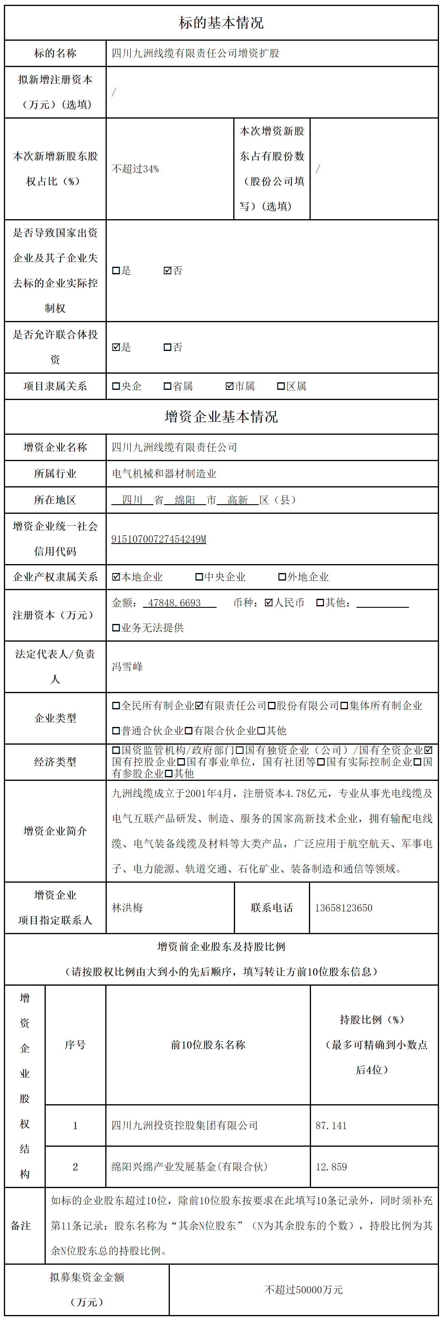 四川九洲线缆有限责任公司增资扩股项目信息预披露