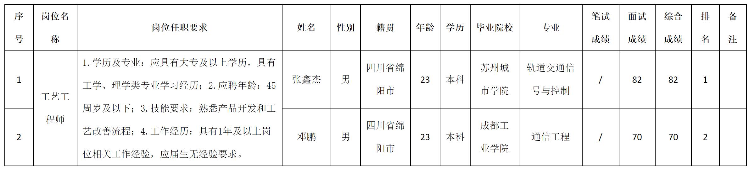 根据四川九华光子通信技术有限公司发布的招聘公告及招聘相关规定,经面试等程序,现将面试成绩予以公示。
