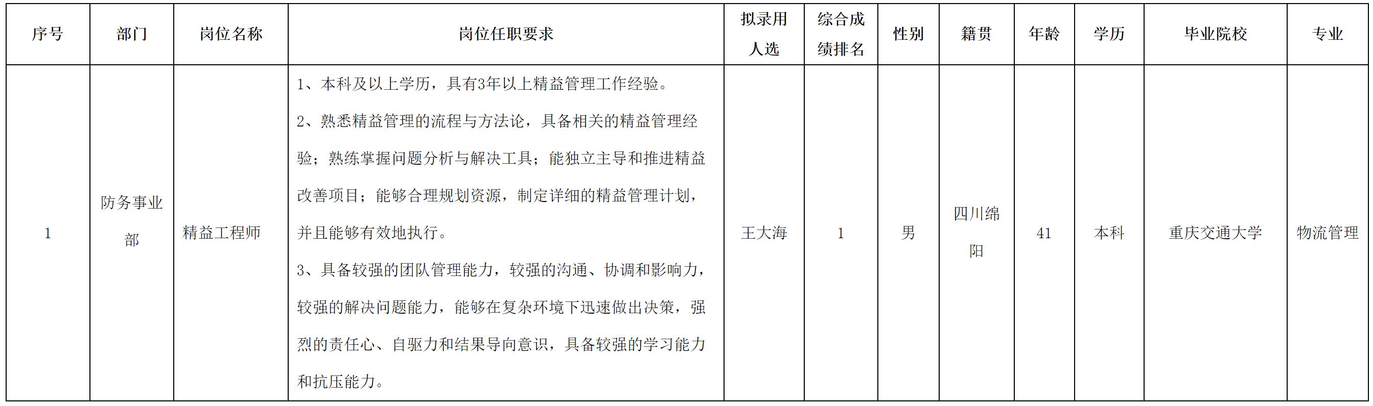 根据四川华丰科技股份有限公司发布的招聘公告及招聘相关规定,经面试、考察、体检等程序,拟录用王大海同志到四川华丰科技股份有限公司工作,现予以公示,具体情况如下: