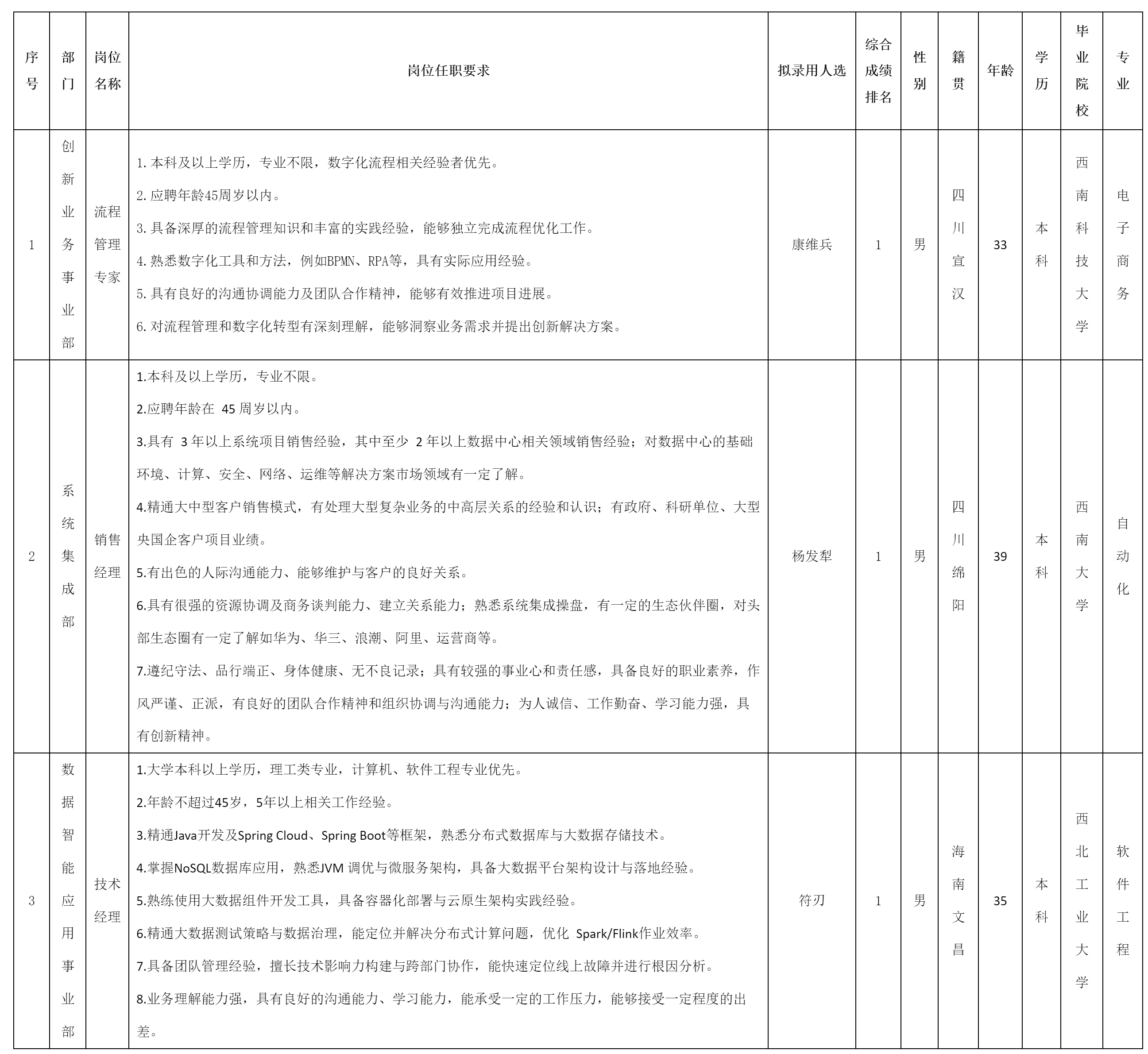 根据四川虹信软件股份有限公司发布的招聘公告及招聘相关规定,经面试、考察、体检等程序,拟录用康维兵、杨发犁、符刃同志到四川虹信软件股份有限公司工作,现予以公示,具体情况如下: