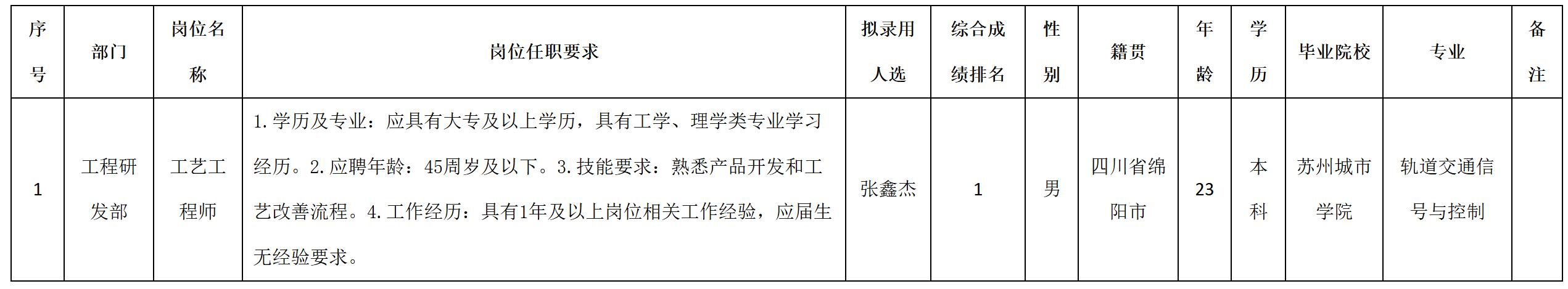 根据四川九华光子通信技术有限公司发布的招聘公告及招聘相关规定,经测试、考察、体检等程序,拟录用张鑫杰同志到四川九华光子通信技术有限公司工作,现予以公示,具体情况如下: