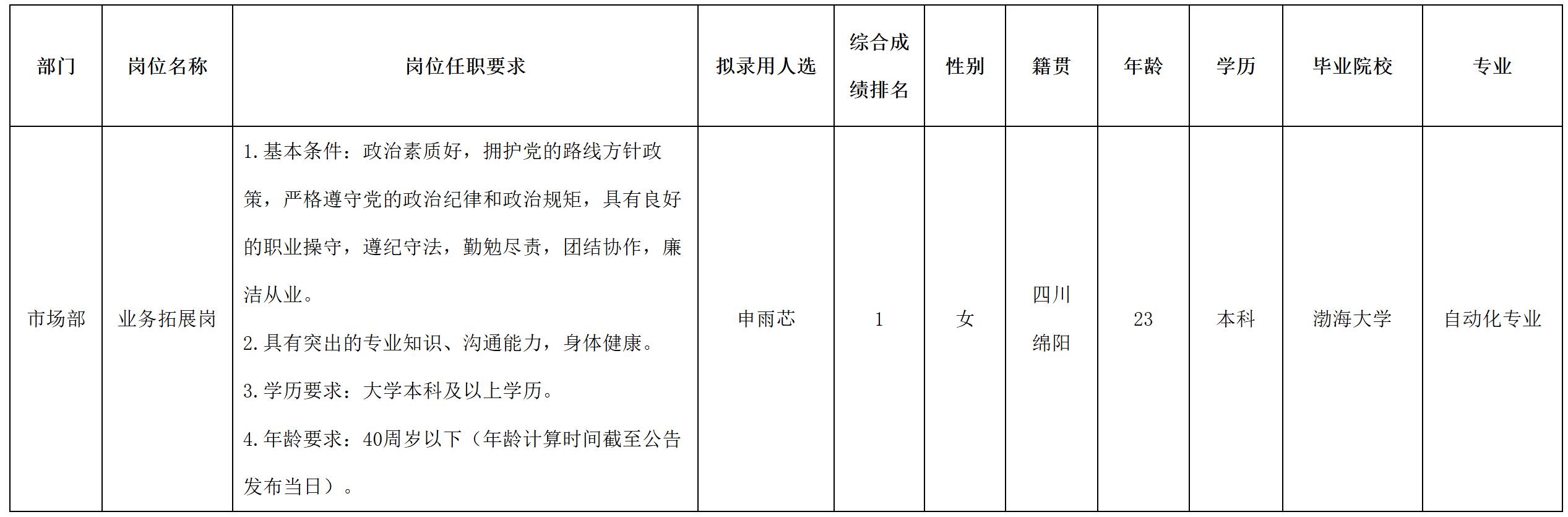 根据绵阳市建设工程质量检测中心有限责任公司发布的招聘公告及招聘相关规定,经笔试、面试、背景调查、体检等程序,拟录用申雨芯同志到绵阳市建设工程质量检测中心有限责任公司工作,现予以公示,具体情况如下: