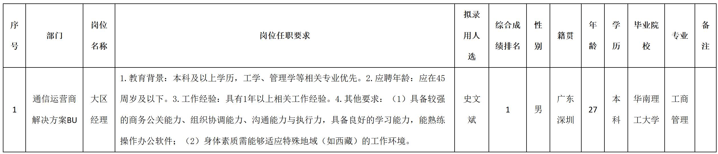 根据四川九州电子科技股份有限公司发布的招聘公告及招聘相关规定,经测试、考察、体检等程序,拟录用史文斌同志到四川九州电子科技股份有限公司工作,现予以公示,具体情况如下: