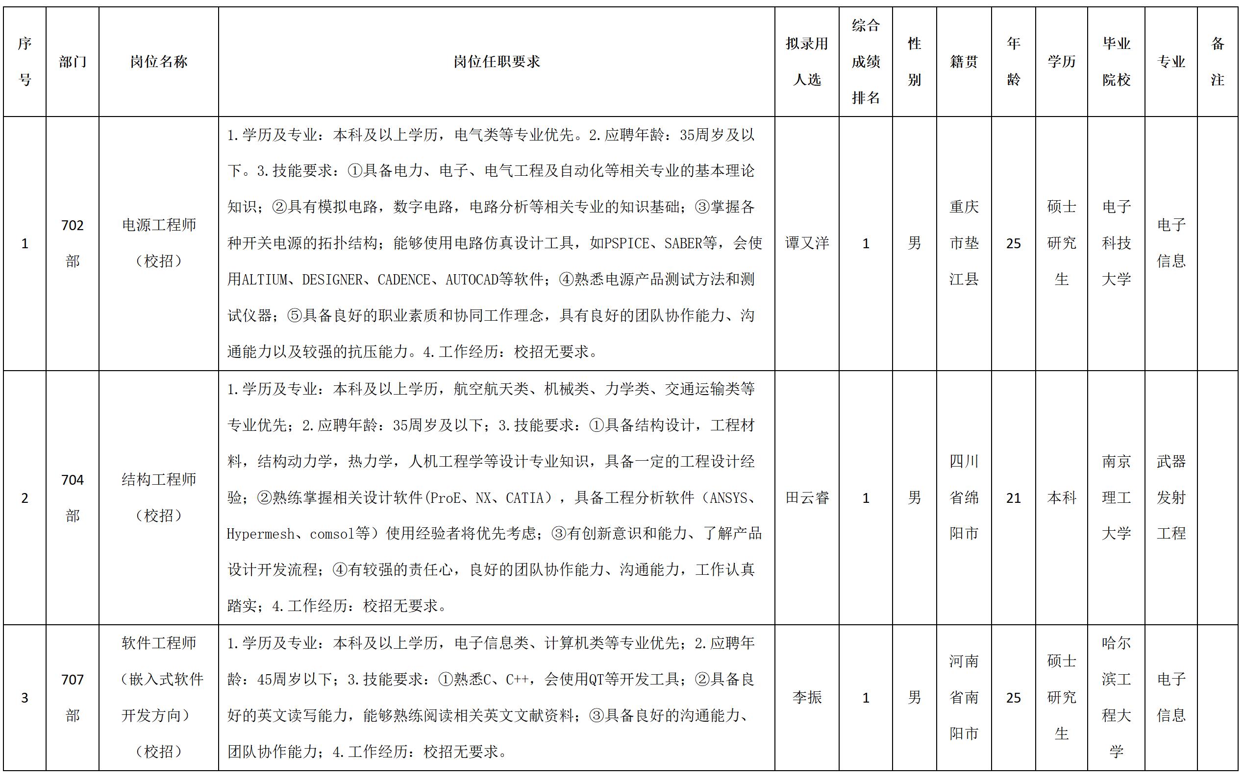 根据四川九洲电器集团有限责任公司发布的招聘公告及招聘相关规定,经测试、考察、体检等程序,拟录用谭又洋等3名同志到四川九洲电器集团有限责任公司工作,现予以公示,具体情况如下: