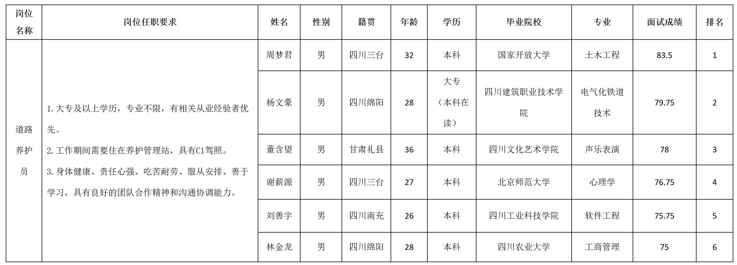 根据2025年退役军人就业服务专项行动——“戎耀归蜀”绵阳退役军人及军属招聘活动及绵阳路桥建设集团有限责任公司招聘相关规定,经面试程序,现将面试成绩予以公示。